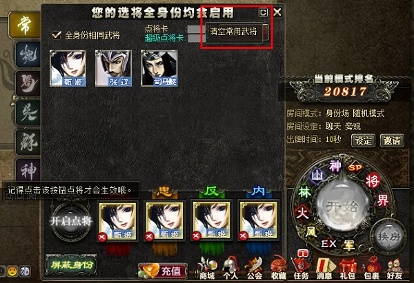 在常用武将的选项中增加清理按钮,喜欢点将的同学整理出适合自己的常用名单快速点将。