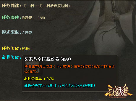 活动奖励:完成活跃度20即可领取父亲节全民抵价券99