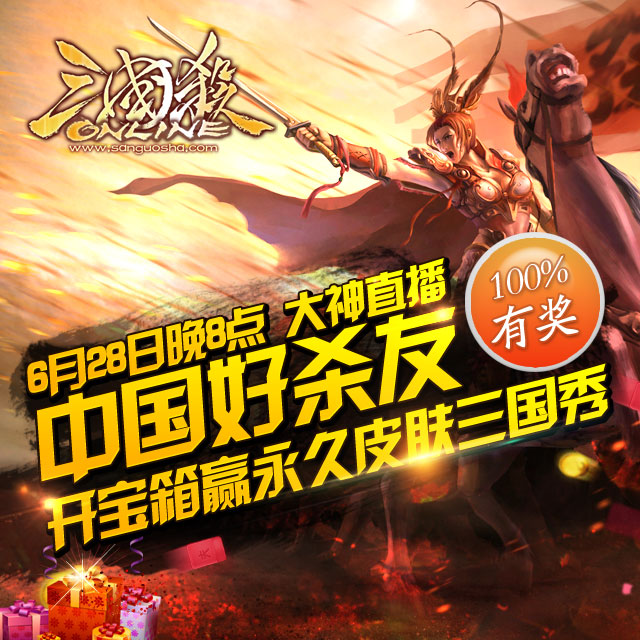 比赛期间通过“大神直播”观看参赛选手的精彩直播,累计在线即可开启宝箱,宝箱包含三国杀OL永久皮肤、永久三国秀和各种超值道具,百分百有奖!