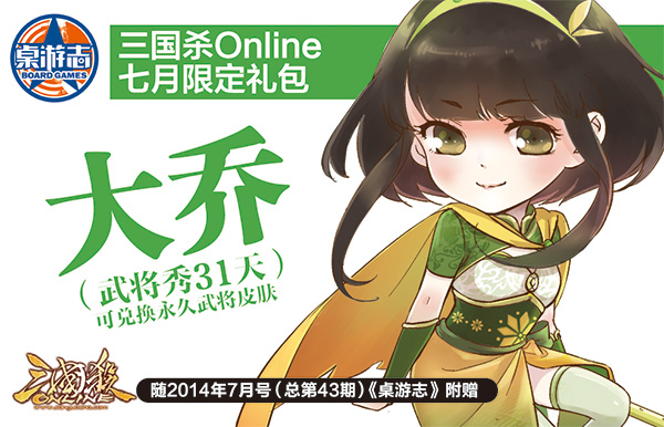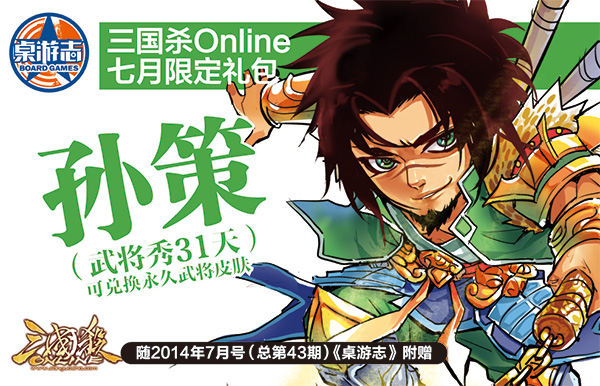 1、三国杀对战卡孙策、大乔三国秀(31天权)随2014年7月号《桌游志》附赠,玩家可以从杂志中随机获得一张三国秀兑换卡(孙策或大乔),凭卡上的刮刮码,可以在《三国杀Online》礼包中兑换对应的皮肤,每张卡限领一次,领取的三国秀为31天使用权。