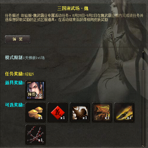 领奖规则:活动奖励将根据您选择的区服奖励道具在活动结束后发放至相应服务器账号内。例如您在体验服魏武霸业完成任务“三国演武场·魏武霸业”并在可选奖励中选择了4-5区万箭齐发,活动结束后将给您在4/5区的账号中发放登基为帝*曹丕(永久)
