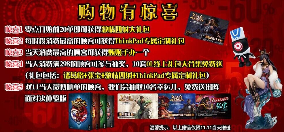 三国杀旗舰店 双11活动、价格大曝光!全场1折起,5折包邮封顶。不仅有激情四射大礼包独家首发,购物5重惊喜(一次购物得OL线上礼包大合集不是梦),藏友不能错过的重磅精品秒杀,还有新品首发必含OL礼包,2014三国杀爆款抄底价。这个双11,蛮拼!!!