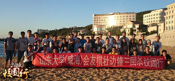 山东大学威海校区会友棋社招新:海边金色沙滩,夕阳斜照,户外活动更精彩。