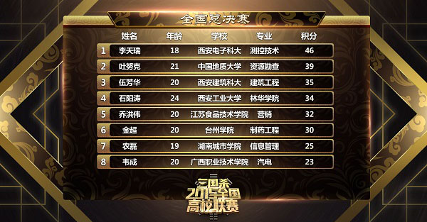 在最终的总决赛积分榜上,冠军、季军和殿军均被陕西省赛四强选手所包揽!其中来自西安电子科技大学的李天瑞同学更以46分的决赛高分居于榜首,获得冠军!