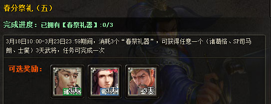 任务奖励:诸葛恪、SP司马朗、士燮的3天时限武将任选其一