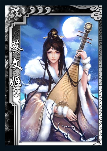蔡文姬是汉末的才女,著名书法家蔡邕的女儿。可惜红颜薄命,半生辗转颠簸,先嫁卫仲道,后被匈奴掳走,随后又被曹操以重金赎回,配于董祀。蔡文姬善书法, 亦精通音律,传世作有《胡笳十八拍》等。在三国杀中,蔡文姬是一个兼具支援和卖血的武将,同时具有极强的死亡技来通过威慑防御敌人的进攻。“悲歌”是一个团队向的效果,可以大幅拖延敌人对己方的进攻节奏,有效保护己方的核心武将。而“断肠”的存在让敌人不能轻举妄动,有效的保证了自己的生存,从而有更多的机会发动“悲歌”。