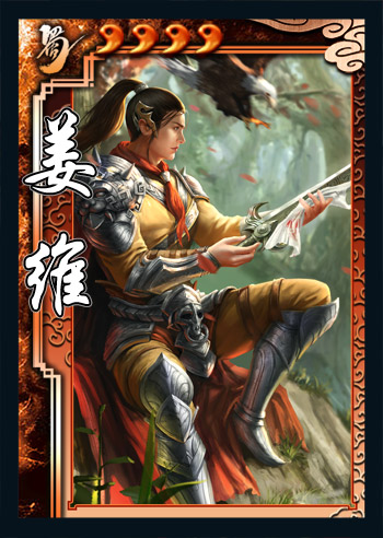 “天水夸英俊,凉州产异才”——姜维作为蜀汉后期的顶梁柱,其性胆大,好用险,用间计怂恿钟会自立,奈何功败垂成。在三国杀中,姜维是一个强力的控制型武将。“挑衅”看似用险,却能够有效打乱敌人的进攻节奏,迫使敌人留【杀】防守,在自己装有防具的情况下更是无所畏惧,每回合稳定的消耗让敌人攻守无法相顾。“志继”则具有极高的威慑,使敌人不敢随意进攻牌少的姜维,而觉醒后获得的“观星”则能够更好地完成控场任务,并配合“挑衅”来留出足够的防御牌。总而言之,姜维对场面的控制力是十分强的。