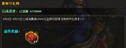 9月9日-9月15日期间,累计消费20000元宝,即可获得1个教师节礼物。