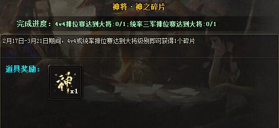 自春季赛开始,任意排位赛达到大将级别,即可领取神之碎片1个。