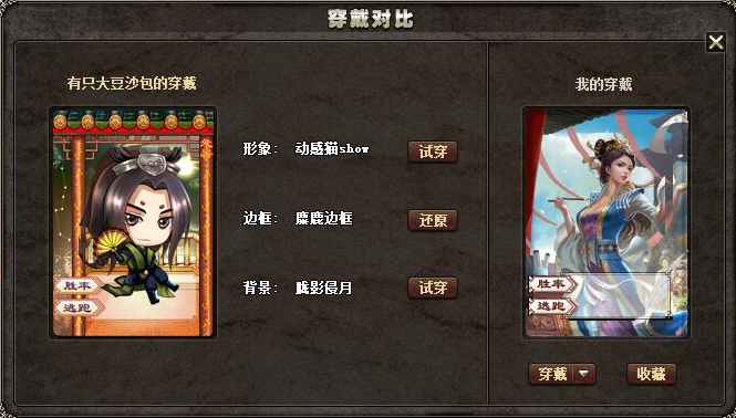 增加三国秀穿戴对比功能,可以查看其他玩家穿戴的具体三国秀,并支持试穿、收藏等操作。