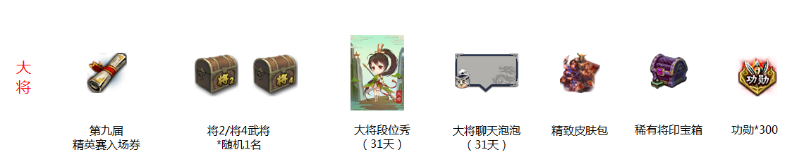 | 进击的排位(二) | 完成1局统率三军排位赛 | 统率三军排位专属武将试用宝箱 |