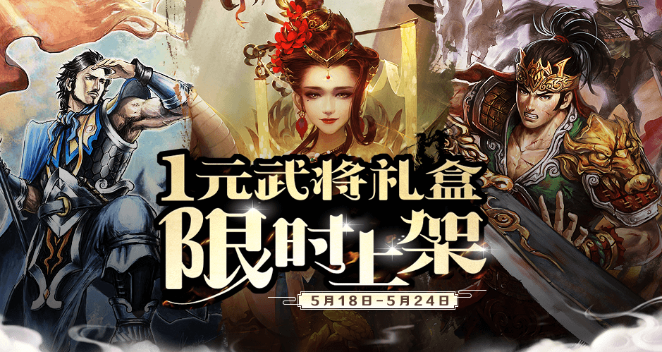 5月18日-5月24日,商城热卖将限时上架新一期的一元武将礼盒,除了传说皮肤的试用权外,礼盒内所包含的道具均为武将相关:永久武将、武将宝券、将魂、银两袋,价格更是低至100元宝,惊喜不容错过!
