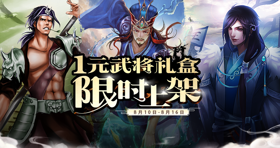 8月10日-8月16日,商城热卖将限时上架新一期的一元武将礼盒,除了传说皮肤的试用权外,礼盒内所包含的道具均为武将相关:永久武将、武将宝券、将魂、银两袋,价格更是低至100元宝,惊喜不容错过!
