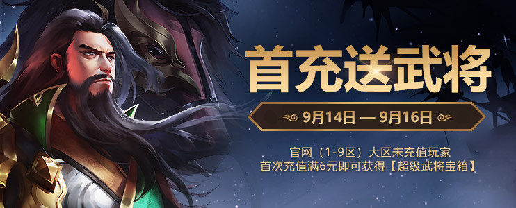 活动期间,官网(1-9区)大区未充值玩家首次充值满6元即可获得【超级武将宝箱】。打开超级武将宝箱必定可获得一个未拥有的武将(点击查看),非卖武将、未上线武将、部分特殊武将除外。