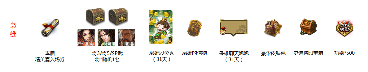 第二阶段:精英赛积分达到2301分以上玩家,可在赛季结束后领取豪华皮肤包*1、大将军印*1、三国秀锦囊*30