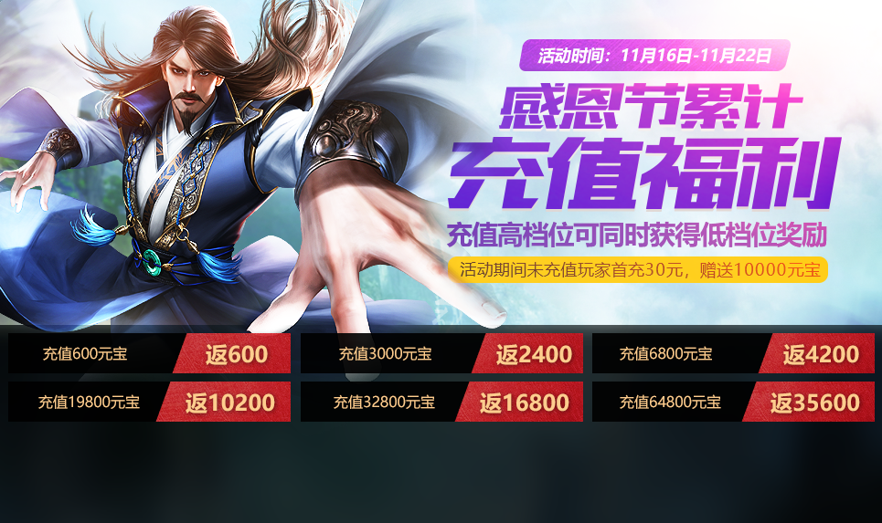 活动期间,玩家累计充值以下档次的元宝我们将会在活动结束后3个工作日内通过邮件的方式发放绑定元宝返利。注:充值高档位可同时获得低档位的奖励。从未充值过的玩家首充30元,赠送10000元宝。