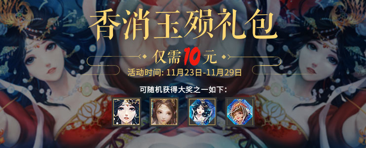商城首页购买【香消玉殒礼包】后可获得形象【银两】*10,并赠送【香消玉殒宝箱】*1:打开宝箱可随机获得传说皮肤【香消玉殒*糜夫人】、或【动态水晶-香消玉殒*糜夫人】、或【动态水晶-轻舞花烛*SP孙尚香】或【萧疏伊人*糜夫人】、皮肤包、精致皮肤包、高级三国秀锦囊等丰富道具其中之一。>查看概率<