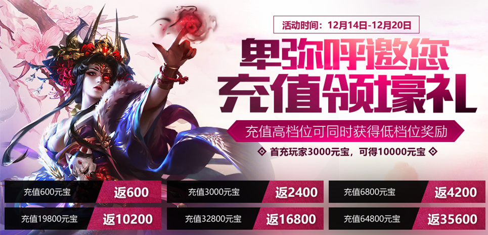 小B从未充值过,在12月14日-12月20日累计充值了3000元宝,他将可以获得10000+2400+600=13000元宝的累充返利。