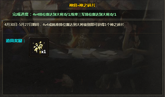 44排位赛或统率三军排位赛任一达到大将段位,即可获得神之碎片1个,集满6个可通过任务兑换神武将箱1个。