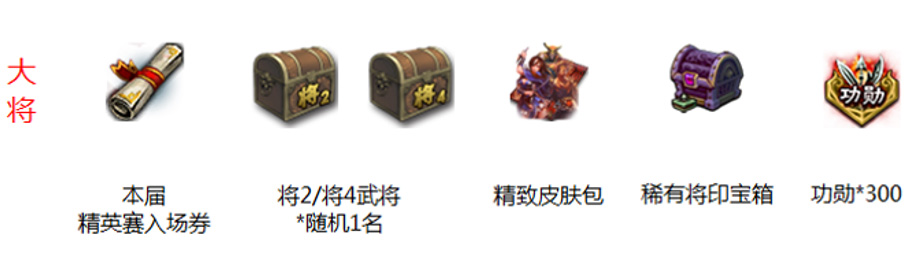 第二阶段:精英赛积分达到2301分以上玩家,可在赛季结束后领取豪华皮肤包*1、大将军印*1、三国秀锦囊*30
