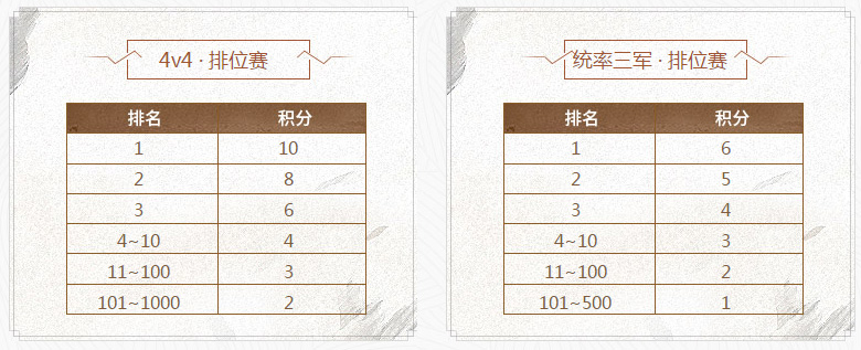 4V4为前1000名,统率三军为前500名,各名次获得的积分数量如下: