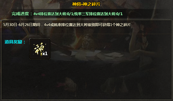 44排位赛或统率三军排位赛任一达到大将段位,即可获得神之碎片1个,集满6个可通过任务兑换神武将箱1个