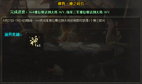 44排位赛或统率三军排位赛任一达到大将段位,即可获得神之碎片1个,集满6个可通过任务兑换神武将箱1个