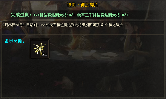 44排位赛或统率三军排位赛任一达到大将段位,即可获得神之碎片1个,集满6个可通过任务兑换神武将箱1个