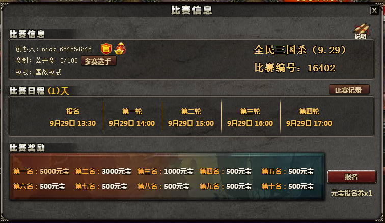 "全民三国杀"官方公开赛共五期,前四期为积分赛,当期比赛前10名选手均可获得元宝奖励。