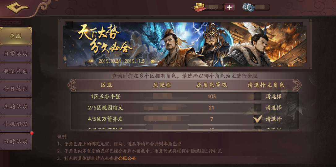 合区准备工作期间,杀友可登录游戏至【合服】面板自主设置需要保留的主角色,其他大区子角色(等级≥50级,或账号历史累计充值金额>0元的账号)数据将根据统一规则合并至主角色下。