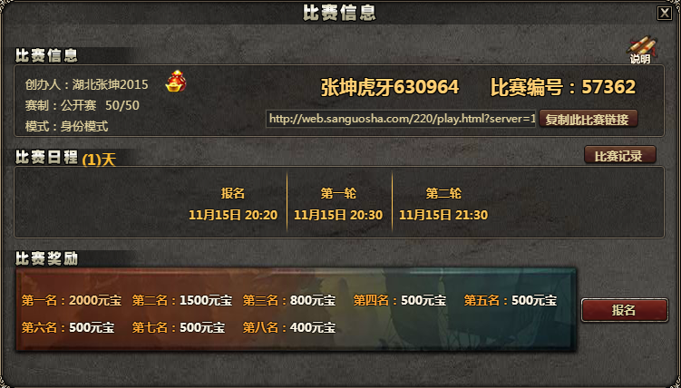 比赛奖励:第1名 2000元宝、第2名 1500元宝、第3名 800元宝、第4~7名 500元宝、第8名 400元宝