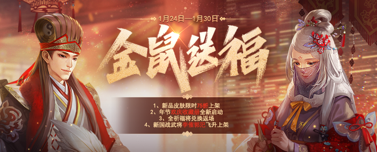 2020年即将到来,现为各位玩家送上全服奖励:【平安福】*1,【祈福灯礼包抵价券(3000抵1000)】*1,【鼠年福袋】*1,【甘露】*1,全服奖励将于1月24日下午5点前发放,三国杀ol的在此预祝各玩家朋友新年快乐,游戏愉快!!!
