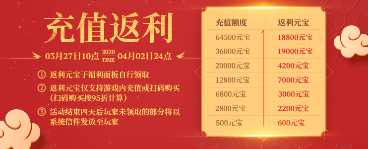 4.活动结束后,该页面会保持四天(4月6日24点)供玩家领取奖励,四天后玩家未领取的返利元宝将通过系统信件发放,请安心充值
