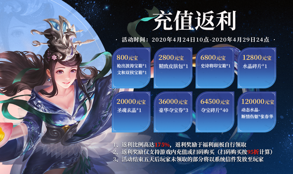 1、4月24日10点-4月29日24点活动期间,玩家在游戏内累计充值以下档次的元宝,可于福利-限时返利面板领取返利道具