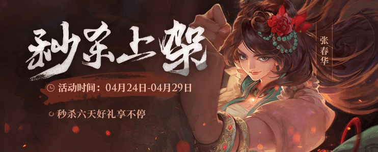 4月24日0点-4月29日24点,拥有断情伤躯*张春华动态皮肤,可以获得【豪华夺宝券】*1,累计限完成1次