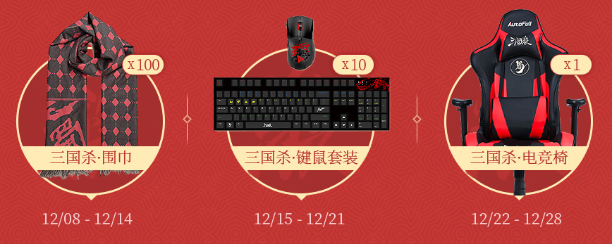 12周年倾情回馈,登录游戏即可参与周年许愿。共计100份三国杀围巾、10份三国杀键鼠套装、1份三国杀x傲风联名电竞椅,开奖日由系统在所有许愿的玩家中随机抽选锦鲤获奖。