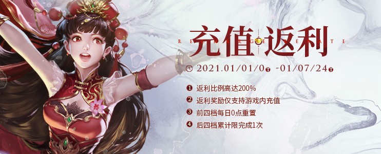 1月1日0点-1月7日24点,累计完成每日充值(二)3次,可以获得【玉颜双娇宝箱】*1,【端瑞洛水宝箱】*1,【夙尚祈新宝箱】*1,累计限完成1次