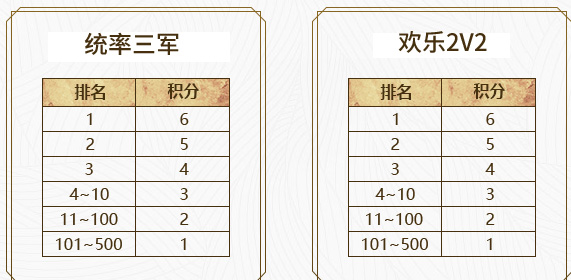 统率三军及欢乐2v2为前500名,各名次获得的积分数量如下: