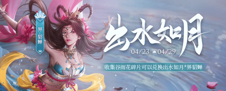 4月23日10点-4月29日24点,拥有出水如月*界貂蝉皮肤可以选择获得五选一【阴包宝箱*3,雷包宝箱*3,观景成赋宝箱*3,帝王之胄宝箱*3,谷雨花礼盒*3】,累计限完成1次