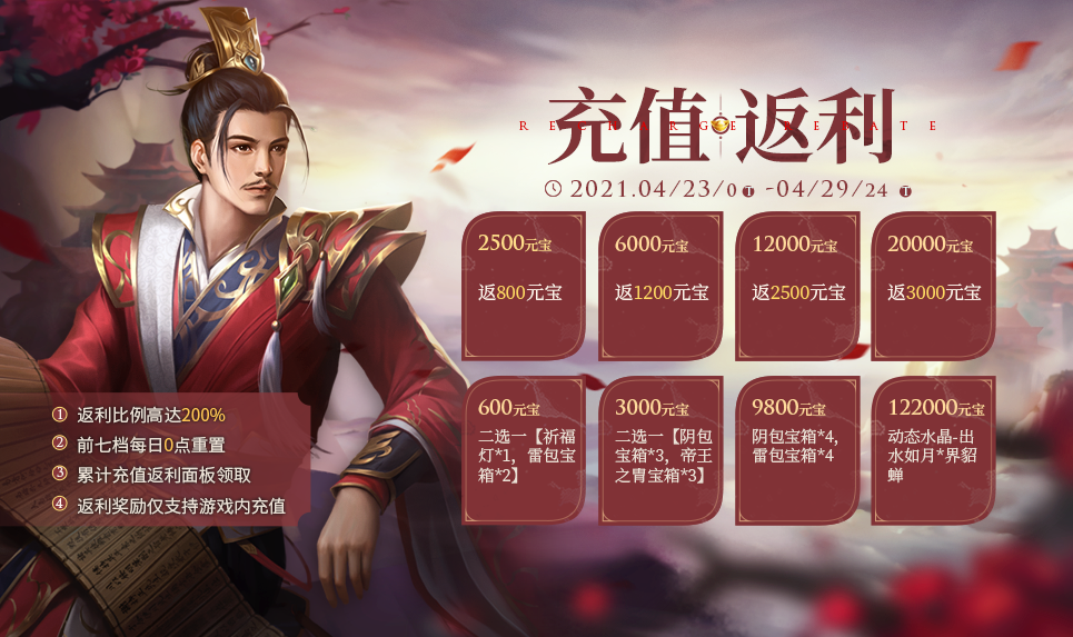 4.23-4.29新品皮肤 秒杀活动 阴雷强将返场 充值返利乐享不停