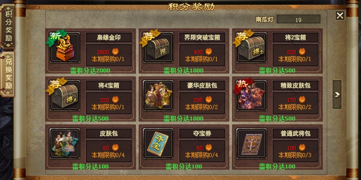 | 2500 | 普通武将包*1 | 南瓜灯*80 |