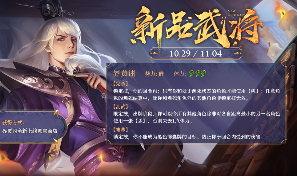 使用武将【界贾诩】完成3局游戏可获得【万圣活跃礼盒】*2,累计限完成1次